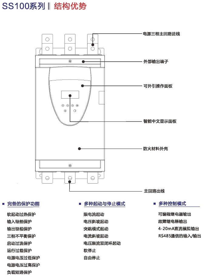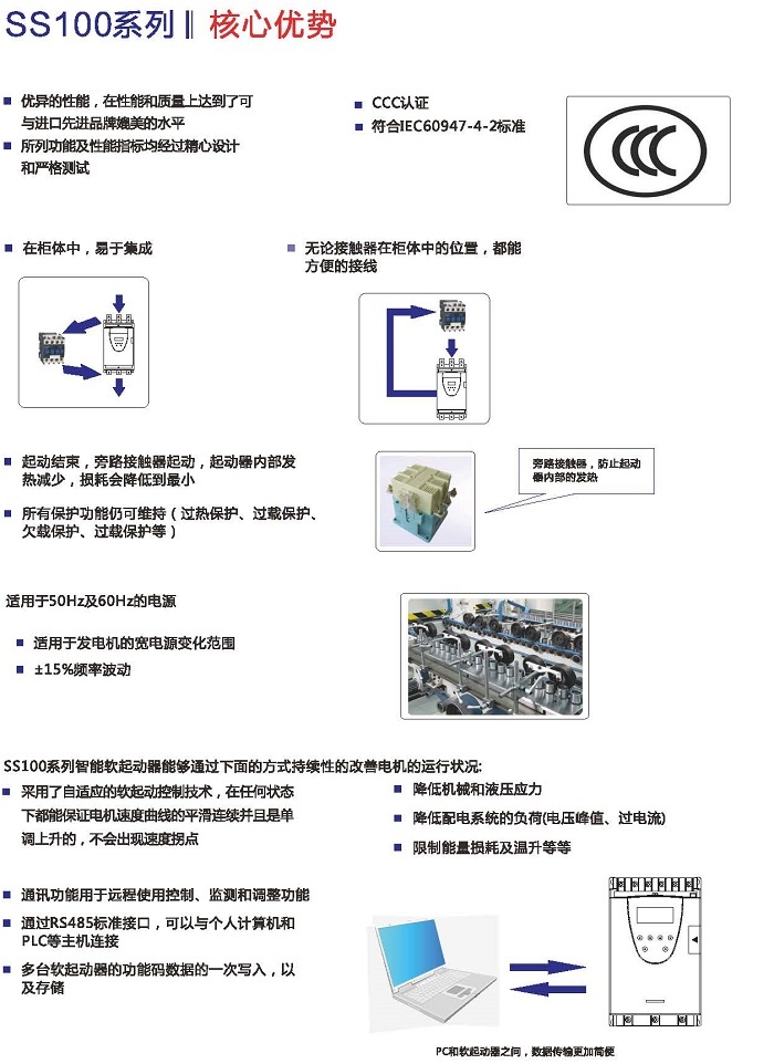 SS100智能軟起動器是我公司自主研發(fā)的、采用電力電子技術(shù),微處理技術(shù)及現(xiàn)代控制理論而設(shè)計生產(chǎn)的具有當(dāng)今國際先進(jìn)水平的起動設(shè)備。該產(chǎn)品能有效地限制交流異步電動機(jī)起動時的起動電流,可廣泛應(yīng)用于風(fēng)機(jī)、水泵、輸送類及壓縮機(jī)等負(fù)載,是傳統(tǒng)的星/三角轉(zhuǎn)換、自耦降壓、磁控降壓等降壓設(shè)備的理想換代產(chǎn)品。
